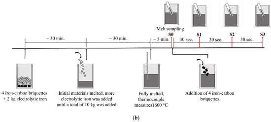 Evaluation of carburization efficiency of ICBs was carried out in a 10 kg capacity induction furnace and its schematic is shown in Figure 2a. A total of 8 ICBs of the same mixture of materials used for the carburization experiment were weighted before each experiment. During Step 1, 4 ICBs were carefully placed in an alumina crucible, and 2 kg of EI was placed on top of it. The alumina crucible was placed in a graphite susceptor for induction heating. All experimental equipment, such as alumina crucible, thermocouple, and the 4 liquid steel samplers were placed inside a furnace chamber and the chamber was kept closed throughout the entire experiment to avoid oxidation of carbon materials. Before each experiment, the furnace chamber was vacuumed and refilled with nitrogen gas three times to remove oxygen inside the chamber. During experiment, a constant nitrogen flow was introduced into the furnace chamber to maintain an over-pressure of 3–15 mbar to avoid air ingress. Heating was performed at a rate of approximately 50 K/min, such that the materials in the crucible were melted in under 30 min. This was to simulate meltdown time of the first scrap basket (20 t) in industrial EAF (60 t capacity) of 20 min []. After 30 min, more EI was gradually introduced into the crucible at a constant mass feeding rate with a vibrating feeder until a total of 10 kg was added. The EI was added gradually instead of in a big batch to prevent skull formation that could disturb the melting process. Then, another 30 min was allowed for melting down of EI and homogenization of the melt, such that a total of 60 min was used, similarly to the tap-to-tap time of a typical EAF of 65–75 min []. After confirming that the melt temperature was 1600 ± 10 °C by inserting a thermocouple into the melt, the steel sample S0 was taken with a liquid sampler to check the initial carbon and sulfur concentrations of the melt. Step 2 of carburization was subsequently conducted by adding 4 ICBs with the same briquette recipe as Step 1 into the melt. The heating powder was increased momentarily to compensate for the temperature drop of the melt. The melt temperature was kept in the range of 1600 ± 20 °C during the subsequent period. Then, 3 melt samples were taken every 30 s (S1,S2,S3) to determine the increase of carbon and sulfur concentrations in the melt. Three consecutive melt samples were taken to ensure a stable carbon concentration had been obtained in the melt for accurate evaluation of RE. The experimental procedure is summarized in Figure 2b. The carbon and sulfur concentrations of all liquid steel samples (S0–S3) were measured by a LECO analyzer (LECO CS844).