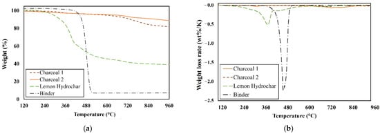 Thermogravimetric analysis at heating rate of 50 K/min of the binder in the present study, and Charcoal 1, Charcoal 2, and Lemon Hydrochar taken from [] at 50 K/min: (a) weight percentage versus temperature; (b) weight loss rate versus temperature.