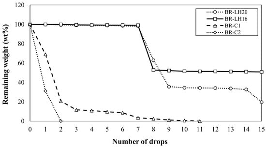 The results from drop test of briquettes are plotted in Figure 4 and these could be used in conjunction with CCS to identify the difference between briquettes. It could be seen that the durability differed drastically between hydrochar briquettes and charcoal briquettes. Both hydrochar briquettes showed no signs of cracking until the seventh drop. The impact resistance of BR-LH16 appeared to be even better than BR-LH20, retaining 50.7% of its initial weight after 15 drops compared to 19.6% of BR-LH20. On the other hand, BR-C1 had only 20.6% of initial weight remaining after 2 drops, 3.5% of initial weight after 7 drops, and was totally destroyed on the eleventh drop. BR-C2 retained only 31% of initial weight after one drop, and was totally destroyed on the second drop. Both hydrochar briquettes were acceptable for transportation and handling since they survived at least seven drops, whereas the impact resistance of the two charcoal briquettes clearly needs to be improved. However, drop tests were only performed for one briquette per briquette recipe and more drop tests are required to get statistically representative results.