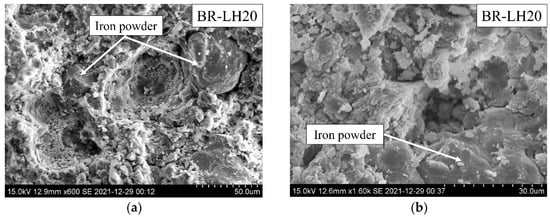 The differences in CCS and drop test performance of briquettes appeared to be closely correlated with the briquette’s appearance at both the macroscale and microscale. The photograph of BR-LH16 revealed a smooth surface, which was also observed from hydrochar pellets produced by Liu et al. []. This not only indicates a high degree of compaction of particles in hydrochar briquettes, but also implies that hydrochar is an effective solid lubricant to minimize friction during ejection of the briquette from the mold to avoid surface crack formation []. SEM images of BR-LH20 and BR-LH16 showed that hydrochar particles formed smooth, compact matrices with a small amount of voids, which is in agreement with findings by other researchers [,,,]. Iron particles were evenly distributed in the hydrochar matrices, indicating that hydrochar powder has good flowability and it rearranged rapidly during briquetting to fill up the gaps between iron particles to “glue” them together. The deep indents created by iron particles in the hydrochar matrices indicate strong mechanical interlocking between hydrochar and iron particles, which contributed to the overall high CCS of both hydrochar briquettes. The addition of the 4 wt% binder in BR-LH16 further reduced the micro-voids between fine hydrochar particles, which could be noticed by comparing Figure 6b,d. The median particle size of binder (d50: 11.39 µm) was less than half of that of hydrochar (d50: 29.88 µm). Thus, the binder could fill up the voids between hydrochar particles to improve connection between particles and increase contact area between particles for bonding. This was likely the reason for better drop test performance of BR-LH16 compared to BR-LH20 after the seventh drop.