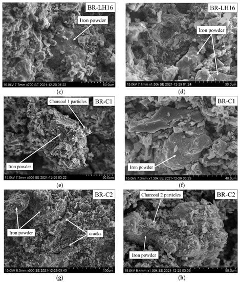 SEM images of fracture surfaces of iron–carbon briquettes of: (a,b) BR-LH20; (c,d) BR-LH16; (e,f) BR-C1; (g,h) BR-C2.