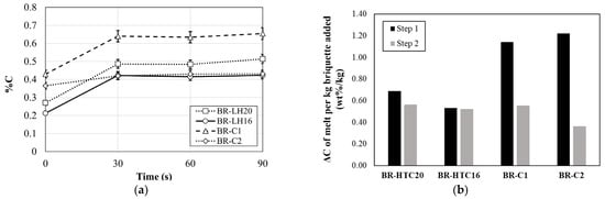 From Figure 7b, it could be seen that Step 1, in general, yielded a higher increase in melt carbon concentration than Step 2, although there were variations among briquettes. During Step 1, charcoal briquettes carburized the melt more effectively (1.14–1.22 wt%C/kg) than hydrochar briquettes (0.53–0.69 wt%C/kg). In order to achieve the same increase in melt carbon concentration, hydrochar briquettes needed to be added maximum 2.3 times the amount of charcoal briquettes. However, during Step 2, melt carbon concentration increase by both charcoal briquettes deteriorated more than 50% compared to Step 1. The melt carburization by different briquettes during Step 2 were not as distinguished during Step 1. BR-C1 yielded comparable increases in melt carbon concentration (0.55 wt%C/kg) with both hydrochar briquettes (0.52–0.56 wt%C/kg), whereas BR-C2 yielded a slightly lower increase (0.36 wt%C/kg). The deteriorated performance of charcoal briquettes during Step 2 was presumably caused by the weak mechanical strengths of charcoal briquettes. Charcoal briquettes broke into smaller pieces and fine powder upon getting into contact with hot melt, some of which escaped the crucible and resulted in carbon losses. Charcoal briquettes could not withstand the stresses arising from rapid thermal expansion of iron particles and devolatilization of charcoal and binder. Briquette destruction phenomena were also observed with hydrochar briquettes, although the degree was less severe. The total weight of steel melt after Step 2 of carburization could not be measured due to practical reasons, and therefore the amount of briquette losses could not be quantified. Overall, hydrochar briquettes yielded a similar degree of melt carburization during both carburization steps. Charcoal briquettes, however, were very sensitive to the method of addition due to its low mechanical strength.