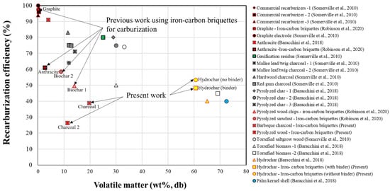 - The recarburization efficiencies from the first stage of carburization were in the order of Charcoal 2 briquette (72.4% for BR-C2) > Charcoal 1 briquette (69.8% for BR-C1) > Hydrochar briquette without binder (57.7% for BR-LH20) > Hydrochar briquette with binder (43.3% for BR-LH16). Only carbon contained in the solid up to a high temperature (1200 °C) could be eventually dissolved in the melt.