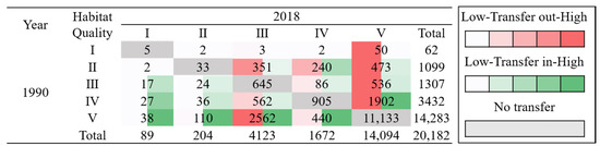 Transfer matrix for each habitat quality category of terrestrial ecosystems in Bohai Bay from 1990–2018 (Area/km2).