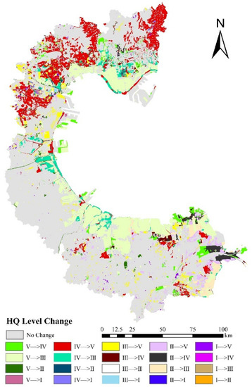 Spatial shift of terrestrial ecosystem habitat quality categories in Bohai Bay from 1990–2018.
