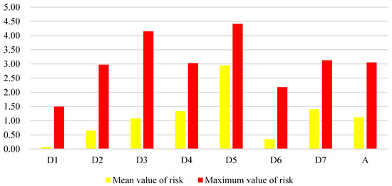 Maximum and mean value of risk in the ecological sources of terrestrial ecosystem in Bohai Bay due to different risk sources (D1—paddy field, D2—dryland, D3—urban land, D4—rural settlement, D5—industrial and construction land, D6—unused land, D7—reclamation area, and A—mean value).