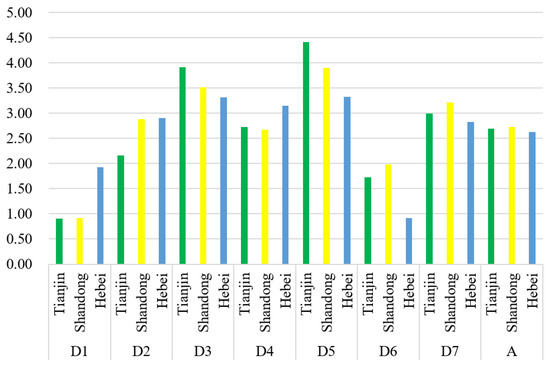 Ecological sources affected by different risk sources in different provinces of Bohai Bay (D1—paddy field, D2—dryland, D3—urban land, D4—rural settlement, D5—industrial and construction land, D6—unused land, D7—reclamation area, and A—mean value).