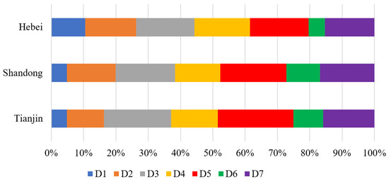 The proportion of risk values generated by different threat sources to the ecological sources of Bohai Bay (D1—paddy field, D2—dryland, D3—urban land, D4—rural settlement, D5—industrial and construction land, D6—unused land, and D7—reclamation area).