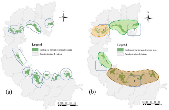 Distribution map of ecological barriers. (a) is 9 ecological barrier cells; (b) is 3 ecological barrier zones.