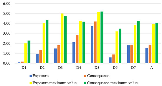 Exposure and consequence of different threat sources on ecological sources in Bohai Bay. (D1—paddy field, D2—dryland, D3—urban land, D4—rural settlement, D5—industrial and construction land, D6—unused land, D7—reclamation area, and A—mean value).