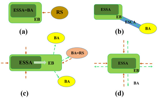 Connotation of ecological barrier. (a) is an embedded ecological barrier; (b) is a guiding ecological barrier; (c) is a strong transmission ecological barrier; (d) is the external diffusion-type ecological barrier. ESSA is an ecological service supply area; BA is the beneficiary area; RS is the source of risk; EB is the ecological barrier; ESSA = BA represents the overlap of ecosystem service supply area and benefit area; BA = RS represents that the benefit area of ecosystem service overlaps with the risk source.
