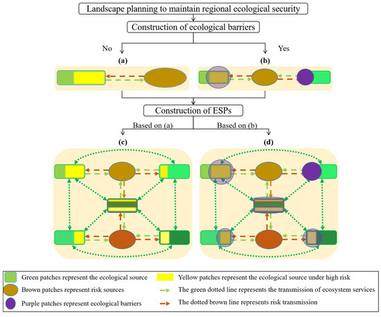 Both ecological barriers and ESPs are landscape ecological plans to maintain regional ecological security [5,31]. The construction of ecological barriers is to protect the structure and function of ecological sources, and the construction of ESPs is to optimize land spatial planning by using the ESs provided by ecological sources. From the perspective of ecological restoration, ecological source is not only the protection object of ecological barrier, but also the basis of ESPs [6,7]. Ecological barriers and ESPs are complementary in both structure and function. The protection of ecological sources by ecological barriers safeguards the long-term potential of the ESPs to provide ESs, while ecological corridors linking multiple ecological sources in the ESPs complete the ecological barriers to facilitate the exchange and transfer of ESs to ecological service beneficiary areas and other ecological service supply areas. In Figure 14, (c) is the basic ESP construction paradigm, focusing on the identification of ecological elements and the correlation among them. (d) is the optimized ESP construction methods, where the interrelationship between human activities and ecological elements is taken into account through the construction of ecological barriers. In Figure 14, (c) ecological sources not only transmit ESs to ecosystem service demand areas, but also exchange ESs among multiple ecological sources. Ecological sources are not only exporters of ESs, but also receivers of adverse impacts from risk sources, and there is instability in the structure and function of ecological sources when disturbed by risk sources. In Figure 14, (d) ecological barriers are constructed in areas of ecological sources disturbed by risk sources. The use of ecological barriers improves the stability of the structure and function of ecological sources, thus safeguarding the long-term potential of the ESPs to maintain regional ecological security.