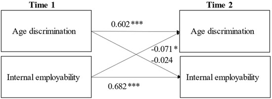 Model 2 extended the baseline model in that internal employability at T1 was added as a predictor of age discrimination at T2. The model fit was good. Age discrimination at T1 (β = 0.600, p < 0.01) and internal employability at T1 (β = −0.071, p = 0.02), but not age (0.027, p = 0.27), significantly predicted age discrimination at T2 (as visualized in Figure 2).