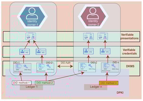 - DPKI: Decentralized public key infrastructure (DPKI) does not require a centralized authority to create keys for actors since actors themselves create them in a decentralized manner. The DID holder has a private key that allows them to control their DID [93,94]. User keys are generated on the client side without relying on a central authority.