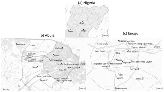 (a) Location of Abuja and Enugu in Nigeria. (b) Study locations in Abuja. (c) Study locations in Enugu.