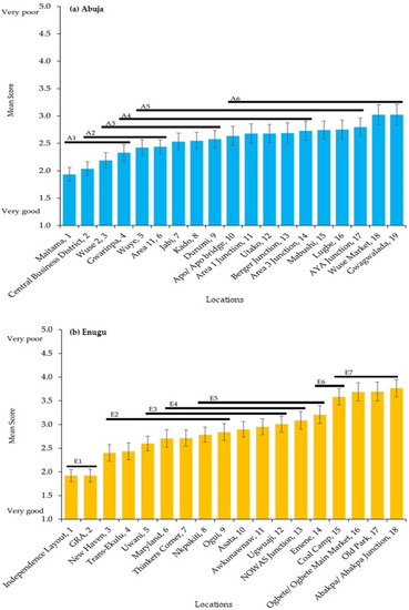 Using the Hochberg post hoc test, the locations were divided into statistically homogenous groups (p < 0.05); six groups from the nineteen locations in Abuja and seven groups for the eighteen locations in Enugu. These are labelled A1 to A6 for Abuja and E1 to E7 for Enugu in Figure 2. In Abuja (Figure 2a), the locations with the worst AQ are Gwagwalada and Wuse Market, while the better AQ locations are those in group A1 (Maitama, Central Business District (Central Area), Wuse 2, and Gwarinpa). Maitama is the only location with an AQ viewed as very good by the respondents (Figure 2a). Figure 2a also illustrates locations in group A6 which are Apo/Apo Bridge, Area 1 Junction, Utako, Berger Junction, Area 3 Junction, Mabushi, Lugbe, and AYA junction in Asokoro, which are rated similarly, with Gwagwalada and Wuse Market being the worst AQ locations. In between the better locations and the worst locations are Wuye, Area 11, Jabi, Kado and Durumi. In Enugu (Figure 2b), group E7 which includes Coal Camp, Ogbete/Ogbete Main Market, Old Park and Abakpa/Abakpa Junction are the locations with the worst perceived AQ. The location with the worst AQ in Enugu is Abakpa/Abakpa Junction. Emene, Ugwuaji, and NOWAS Junction are other locations with perceived poorer air quality that also have Nkpokiti, Ogui, Asata, and Awkunanaw in the same group. The locations with the cleanest air in Enugu are Independence Layout and GRA in group E1 with equal scores, followed by New Haven and Trans-Ekulu.