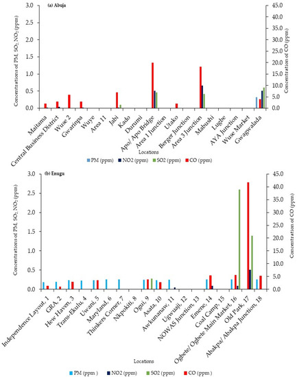 To address the issue of varying methods and approaches taken across the published studies, source [46] was employed wherever possible for Abuja, and thus if multiple sources reported data for a location, then only [46] was employed. The other sources [49] were only used to fill locations not covered by [46]. In Enugu, the same method was applied. Most of the data came from sources [51] as this is the one with the highest level of coverage across locations, followed by source [50]. Again, if multiple sources were available for a location, then [51] was used as the “default”. Other sources with limited data which are not in the graphs are [52,53,54] for Abuja (Table S4) and [55,56] for Enugu (Table S5), and they identified some locations in both cities to be of high concentration of air pollutants instrumentally obtained.