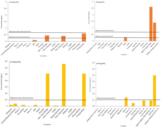 (a) Instrument-measured SO2 with taste and odour detection levels in Abuja based on sources [46,47,48,49]. (b) Instrument-measured SO2 with taste and odour detection levels in Enugu based on source [50]. (c) Instrument-measured NO2 with odour detection levels in Abuja based on [46,47,48,49]. (d) Instrument-measured NO2 with odour detection level in Enugu based on sources [50,51]. Figures are the mean daily concentrations for the pollutants.
