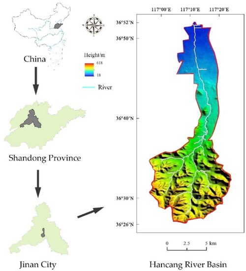 As shown in Figure 1, the study area is the Hancang River Basin. The basin area is 100 km2, which is a small basin. The Hancang River is located to the southeast of the Licheng District, Jinan city, and is a tributary of the Xiaoqing River. The Hancang River is a naturally formed, rain-sourced flood drainage river in a southern mountainous area. The total length of the main stream is approximately 27.8 km, and the basin mainly has a warm temperate monsoon climate with four distinct seasons; the annual average temperature is 13.3 °C and the average precipitation is 783.27 mm. The average precipitation from June to September accounts for 60.26% of the annual average precipitation, and the greatest amount of precipitation occurs from July to August. The river has steep slopes and rapid flows; its maximum elevation difference is 339 m, it receives concentrated precipitation, and it is prone to flooding.