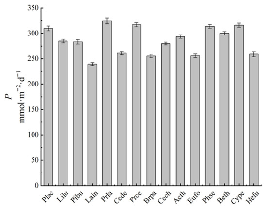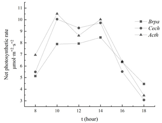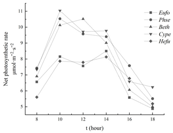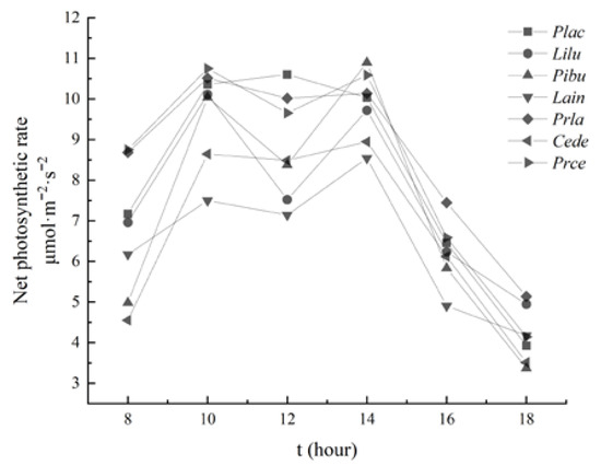 Plant net photosynthetic rate (Pn) determination was performed using an SY-1020 portable photosynthesis analyzer. From 24 July 2020 to 3 August 2020, the weather was clear with sufficient light, no wind, and no breeze. From 0800 to 1800, every 2 h, three representative and healthy plants were selected. On the selected plants, four to six functional leaves with robust growth, similar size, and good growth were randomly selected. Five instantaneous time-lapse rate values were recorded for each leaf without leaving the body, and then their averages were taken. The average of three samples for each plant was taken, and the order of the tree species was determined to be unchanged over each time period.