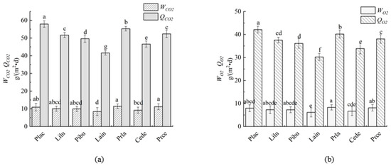 The trend of fixed CO2 and released O2 per unit of land area of three small trees was the same as that of the unit leaf area. The highest was Acer palmatum Thunb. The fixed CO2 per unit land area and the released O2 amount were 52.2 g·m−2·d−1 and 37.96 g·m−2·d−1, respectively, and the lowest was Broussonetia papyrifera, with a unit land area fixed CO2 and released O2 amount of 34.42 g·m−2·d−1 and 25.03 g·m−2·d−1, respectively.