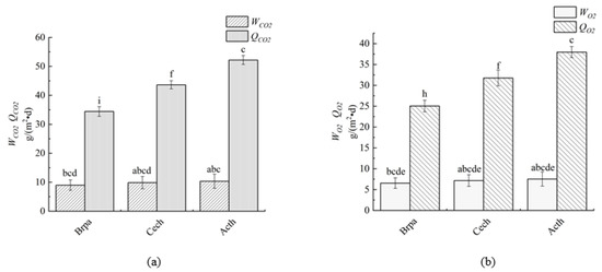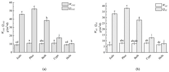 The carbon sequestration and oxygen release per unit leaf area and unit land area of typical shrubs in the Hancang River Basin are shown in Figure 8. The average carbon sequestration per unit leaf area and unit land area of the planted cover were 10.17 g·m−2·d−1 and 32.93 g·m−2·d−1, respectively, and the average oxygen release was 7.40 g·m−2·d−1 and 23.95 g·m−2·d−1, respectively.