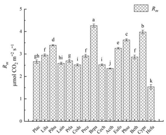 The leaves of 15 typical vegetations maintaining their breathing capacity. Different letters above the bars indicate significant differences at p < 0.05 level.