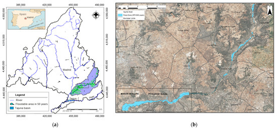 Study area (a) Location of the Tajuña basin in the Community of Madrid and flood-prone areas (b) Detail of the flooding area in the Tajuña river basin.