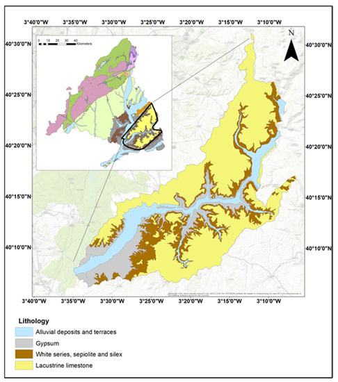 The river valley, with a NE–SW direction, has a rigid morpho-structural alignment due to discontinuities in the basin’s basement. The materials that make up this basin correspond to the sedimentary deposits of the central basin of the Tertiary Tagus depression, detrital evaporitic sediments deposited in an endorheic basin in conditions of climatic aridity during the Miocene, crowned by limestone from the end of the Miocene–Pliocene (Plateau Serie), and covered by Quaternary deposits of colluvial, fluvial and eolian origin [22].