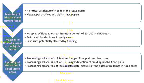 This paper aims to update the exposure to flood risk in a catchment area of the Community of Madrid (Spain) linked to primary sector activities, albeit affected by the urban expansion of the capital. This research starts with the updating of the flood inventory, encompassing episodes documented between 1629 and 2020. The inadequate occupation of the territory means that floods continue to cause significant damage nowadays. It is worth highlighting the two recent floods (2019) that occurred just 15 days apart and caused serious damage to several towns in the basin. The areas at risk of flooding are obtained from the National Floodplain Mapping System, and the maximum and minimum floodable volume in the sector of the Tajuña River basin with the highest exposure to flooding has been calculated. The Sentinel 2 image in false colour (RGB bands 11-2-3, 11-8-3 and 12-11-8) and its transformation to colour properties (Intensity, Hue and Saturation) has made it possible to determine the extension of the riparian vegetation and the irrigated crops located in the alluvial plain. The SPOT 6 image with higher spatial resolution has allowed us to update the mapping of buildings located in areas at risk of flooding. Finally, based on cadastral data, a detailed cartography of built-up areas in areas at risk of flooding is provided. They affect buildings built mainly between the 1960s and 1990s, although the most recent buildings are built on agricultural land in the alluvial plain, even though current regulations prevent the occupation of these lands.