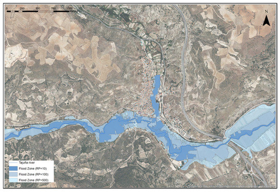 The Tajuña basin in the Community of Madrid has several stretches at risk of flooding, although in general this is low, as it probably has an impact within a 500-year return period (Figure 1). However, when descending to high risk (10-year return period), one municipality, Perales de Tajuña (Figure 5), stands out, with part of the urban centre affected. In addition, another part of this village is also affected by the return period of 100 and 500 years, with overlapping areas. In another three (Villar del Olmo, Orusco and Valdilecha) this risk is small or does not affect built-up areas for the moment [30].