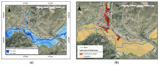 Flood-prone areas in Perales de Tajuña (Madrid): (a) Estimated flood volume; (b) Land uses potentially affected by flooding.