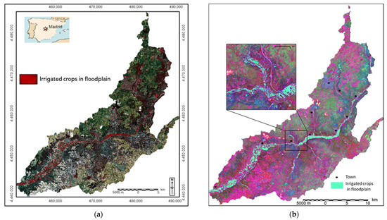The good results obtained by using satellite imagery for monitoring and mapping inland water bodies (ponds, lakes, reservoirs, etc.) [38,39] can be extended to the delimitation of floodplains. These can be clearly identified in multispectral images thanks to the significant response of the near-infrared to hygrophilous vegetation and of the mid-infrared channels to humidity. In turn, the image resulting from the RGB to IHS transformation used for the delineation of shallow ponds [38] also provides very good results for mapping the floodplain and identifying its dominant land use.