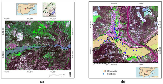 SPOT 6 images: (a) flood area between Morata and Perales de Tajuña and (b) mapping of buildings on the flood plain.