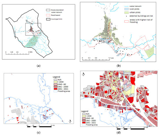 In Figure 9b,c, scattered buildings located on the flood plain have been included, which places them in areas at risk of flooding. The population growth of this municipality from 2000 to the present (close to 30%, Figure 3) is reflected in the recent occupation of the floodplain according to these cadastre data. Therefore, exposure to floods is also increasing.