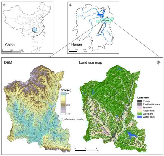 Geographical location, digital elevation model (DEM), and land-use map of the Jinjing river catchment and 120 sub-catchments within. The DEM and land-use data were obtained from the Hunan Provincial Geomatics Information Center (http://www.hnpgc.com, 1 December 2021).