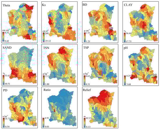 The average values of the selected eleven parameters, covering soil physical, hydraulic, chemical, topography, and anthropogenic factors settings, were estimated in the 120 sub-catchments (Figure 2). The soil physical and chemical settings were calculated from the series interpolated maps of soil properties. The anthropogenic setting includes the parameters of population density (PD) and the ratio of arable land to woodland (RATIO). The PD, representing the urbanization ratio in the study region, was estimated from the annual population statistics of the local government and was also corrected by a household survey in 2015. The RATIO, representing the intensity of agricultural development, was estimated based on a land-use map. The topographic setting includes the degree of relief (RELIEF) that describes the topographic characteristics and was estimated from the DEM by using Neighborhood statistics (10 × 10 m) in the spatial analysis tools of the ArcGISTM 10.5 software.