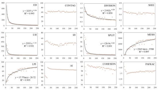 A suite of 12 commonly used landscape-level metrics was used to quantify the landscape pattern in the Jinjing river catchment and the 120 sub-catchments, and then their responses to changing grain size were investigated. The landscape-level metrics included the Edge Density (ED), the Contagion index (CONTAG), the Landscape Division Index (DIVISION), Shannon’s Evenness Index (SHEI), the Landscape shape index (LSI), the Interspersion and Juxtaposition Index (IJI), the Splitting Index (SPLIT), the Effective Mesh Size (MESH), the Landscape Shape Index (LPI), the Aggregation Index (AI), the Patch Cohesion Index (COHESION), and the Perimeter-Area Fractal Dimension (PAFRAC). Because of the large data among multiple scales, several batch ftp files, which were used in FRAGSTATS 4.2 to calculate landscape metrics [], were built by R software (http://www.r-project.org, 14 December 2021).