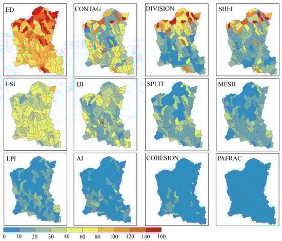 The scale effect of the landscape pattern and its spatial variating strength were quantified at catchment and sub-catchment scales, respectively. Firstly, at the catchment scale, the 12-landscape metrics exhibited different scale effects in scaling functions (Figure 3). The ED, DIVISION, LSI, SPLIT, MESH, and LPI presented a stronger scale effect with the increasing grid sizes, among which the first four and the last two metrics were well fitted by the power and logarithmic functions (R2 = 0.83–0.99, p < 0.001), respectively. In contrast, the CONTAG, SHEI, IJI, AI, COHESION, and PAFRAC demonstrated weak spatial scale effects and irregular changes with the increasing grid sizes.