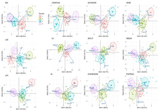 The 120 sub-catchments were classified into four categories for the 12-landscape metrics according to the selected classifying variables (Table 2, Figure 5). The ratios of between-cluster sum of squares and the total sum of squares for the 12 classifications were 64.0–70.7%. The values of five classifying variables for categories I and IV were distributed in opposite poles. For category I, the PD, Ratio, and Sand had smaller values, while the landscape metrics (i.e., ED, CONTAG, DIVISION, and SHEI) possessed the maximum SSE. For categories II and III, the PD and Ratio had larger values, and Relief held moderate values. Maximum SSE for the landscape metrics (i.e., LSI, IJI, SPLIT, MESH, LPI, and PAFRAC) all appeared in category II.