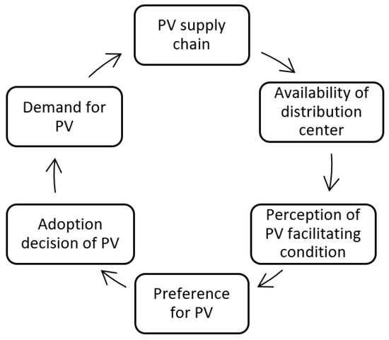 The adoption and diffusion model, which is widely used in modeling energy transition, generally focuses on two factors, i.e., attitudes and finances [16]. Numerous studies have analyzed the rate of PV adoption by considering both factors simultaneously in which financial factor was used as constraints in behavioral models [17]. Some studies such as Rai and Robinson [18] incorporated behavioral and financial factors in the adoption model to provide more opportunities to study each factor comprehensively. In PV adoption modeling, behavioral and financial factors have been discussed in many studies [19]. However, none of them evaluated the availability of supporting facilities from the PV firms. On the other hand, the sufficient availability of PV has been crucial in Indonesia [20], which explains the slow diffusion process. Figure 1 shows the relationship between the PV adoption decision and its supply chain. The PV firms normally use the estimated demands to plan and design the optimized supply chain to meet the demands. Their distribution center (DC) provides PV and its supporting services, thus creating confidence concerning PV systems’ reliability and easy access to households. These facilitating conditions directly influence actual behavior [21]. This is resonated by the Theory of Planned Behavior (TPB) [22], which modeled facilitating conditions as a direct antecedent of actual behavior. In this study, the adoption of PV depends on the available and easy services provided by PV firms. In turn, the supply chain configuration is influenced by the demand for PV. This phenomenon, indicating a chicken-egg problem, is illustrated in Figure 1.