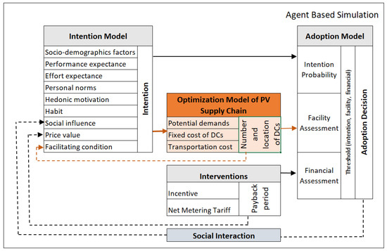 The mechanism underlying the dynamic pattern of PV adoption needs to be understood to formulate the effective and efficient interventions needed to accelerate PV diffusion. The adoption of renewable energy normally faces challenges due to individual heterogeneity [3], complex interactions [4,5], high initial investment costs, and imperfect information [6], sometimes leading to the emergence of irrational decision-making processes [7]. Aggregate models such as the Bass model [8], which generalize the diffusion process based on differential equations, cannot capture individual interactions [9], individuals’ heterogeneity, and the complex dynamics of social processes that shape the diffusion [10]. Therefore, ABM is a promising approach for simulating energy transitions due to its ability to model the decision-making of various stakeholders as well as interaction among stakeholders and with other environments [7]. As an innovation, the PV technology requires a high level of information regarding financing, installation, operation, and maintenance to facilitate its adoption. The existence of local solar companies plays an essential role in providing information to increase relative advantages and reduce the complexity perceived by potential adopters [6]. The absence of facilities within households’ reach is perceived as a lack of support from the industry for adoption, thereby impacting household decisions to adopt PV. This condition is in line with the findings of preliminary research, which stated that the absence of local solar company services hinders PV adoption in rural areas of India [11] and Indonesia [12]. Ideally, interventions should be targeted to both the demand and supply sides [13]. Therefore, the present study incorporates both demand (which is influenced by households’ decision-making) and supply (which is influenced by the network of PV supply chain) in the developed model. Most PV transitions have modeled the supply element exogenously [14,15]; therefore, this study aims to model the supply aspect endogenously, which interacts with the demand aspect. The novelty of the present study has lied in the development of an integrated model that addresses endogenously both the demand aspects involving psychological and social factors in decision-making and the supply aspects dealing with technical factors of PV infrastructures, in addition to governmental interventions. The study has also applied a hybrid simulation-optimization model of the PV system, which is still little explored in the existing PV literature.