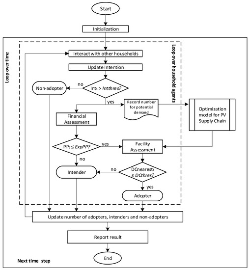The number of households who have intention larger than its intention threshold was entered into the optimization model as dkt variable. The optimization model results in the optimized number and location of DCs to meet the predicted PV demand. The optimized DCs are then set into the simulation model. The procedure is iterated at every time step.