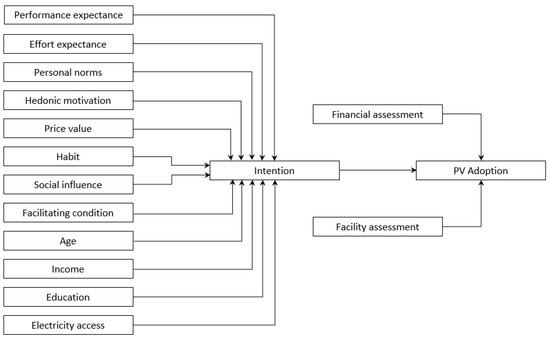Several studies have shown that intention is not corresponding to actual behavior [4,43], rather the adoption behavior is also influenced by facilitating conditions that may favor or hinder the intention [21,44]. Facilitating condition is defined as the individuals’ perception of the resources and support available to perform a behavior [21]. Furthermore, Klöckner et al. [57] identified that structural/facilities, economic, effort, time consumption, low consumer efficacy, and lack of trustworthy and relevant information were the most important barriers to energy efficiency. The PV firms providing PV infrastructure influence household agents in terms of the perceived relative advantage and complexity of using the PV [58], implying that PV availability controls the adoption behavior. In addition, perceived affordability is often cited as the most critical barrier to adoption [59]. According to Vasseur and Kemp [60], financial aspects require in-depth analysis, with the financial assessment conducted to control an individual’s ability to perform behavior using the PV system. Subsequently, both facility assessment and financial assessment are direct predictors of PV adoption, in addition to the intention. Figure 4 presents the households’ decision-making on PV adoption developed in the present study.