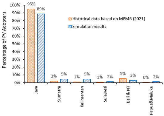 At the micro-level, a validation test was conducted to evaluate the distribution of PV adopters at the end of 2021 concerning the geographical region, as shown in Figure 6. Statistical analysis indicates the non-significant difference in the geographical distribution of the PV adopters between the simulated data and the actual data according to MEMR (χ2 = 7835; df = 5; p = 11.070). Thus, the hybrid model has been able to reproduce the pattern of historical data of PV users both at the macro and micro levels.