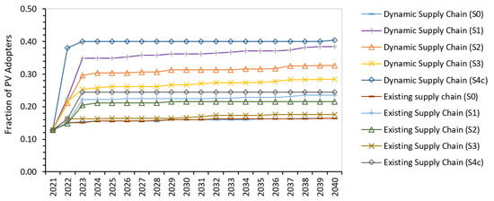 Three performance indicators, i.e., adoption rate, supply chain unit cost, and total greenhouse gases (GHG) reduction were applied to represent the socio-technical, financial, and environmental performance of the PV system. The adoption rate was measured based on Equation (21).