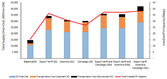 The total supply chain cost is calculated based on Equation (14). Accumulated PVcapt represents the accumulated installed PV system.