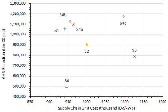 With respect to the environmental performance of the system, the environmental benefits measured by the potential for GHG reduction due to the shift from electricity generated by coal to solar electricity were evaluated and shown in Table 5. Figure 13 presents the trade-off between the supply chain unit cost and the environmental benefit for all scenarios. It can be observed that the baseline scenario (S0) performed the worst. Among single interventions, the export tariff scenario (S1) performs best. Better performance is obtained when the export tariff scenario (S1) is combined with incentives (S4b) or campaigns (S4a). The combination results in a 1% increase in supply chain costs and provides a 3% reduction in GHG. However, when all three interventions were introduced, it leads to a 16% increase in supply chain costs but only an 11% increase in GHG reduction.