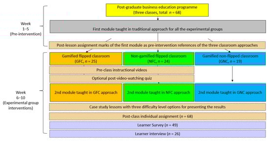 All in-class lessons were conducted face-to-face after city lockdowns were lifted. In the first module (weeks 1–5), the students in all three experimental groups learned under the traditional classroom approach (i.e., teacher-centric didactic approach with no pre-class videos and gamification). The assignment marks from the first module were recorded as pre-intervention references. The three instructional interventions were adopted for the respective experimental groups in the second module during weeks 6–10 (Figure 2). For the flipped classrooms (GFC and NFC), eight sessions of pre-recorded instructional videos with a duration of 30 min each were recorded by the module teacher and provided via the institution’s learning management system (Moodle). Self-evaluation multiple-choice quizzes with only ten questions were offered to avoid heavy cognitive load in the pre-class stage of learning [,].