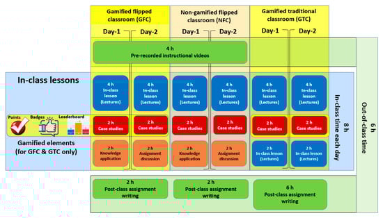 The face-to-face lesson schedules were the same across the three experimental groups for the first four morning hours of lecture lessons. This was followed by two hours of case study lessons in the early afternoon for all three classrooms (GFC, NFC, and GTC). The case study lessons served to expand the scope of learning and knowledge through peer interactive and collaborative learning. For the flipped classrooms (GFC and NFC), there were two hours of knowledge application and assignment discussion lessons in the late afternoon of Day-1 and Day-2, respectively. In contrast, for the non-flipped classroom (GTC), there were lecture lessons in the late afternoon of both Day-1 and Day-2. Figure 3 provides details of the lesson schedule.